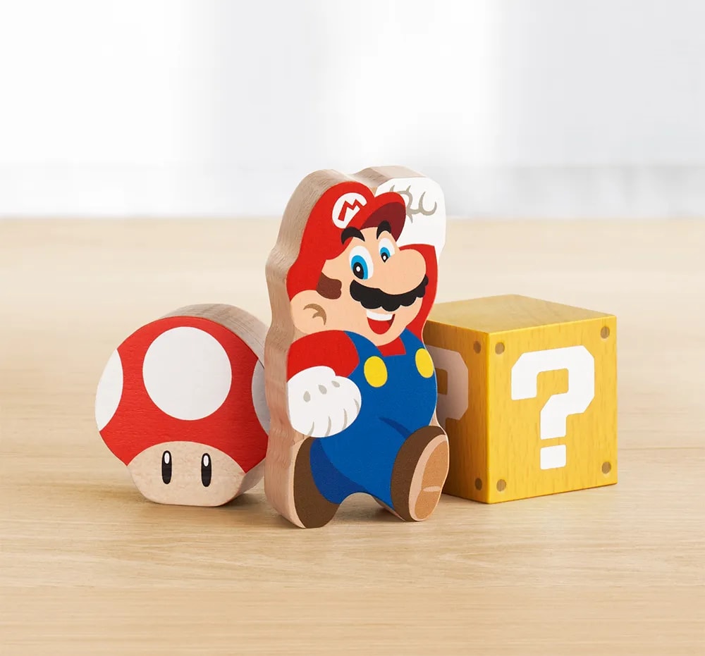 Das größere Set enthält Holzklötze von Mario, Luigi, Prinzessin Peach, Yoshi, so wie verschiedenen Items und Gegenständen wie dem ?-Block und einer Röhre. Die Verpackung dient als Diorama-Hintergrund oder Ausstellungsplatz für die Kreationen der Kleinen.